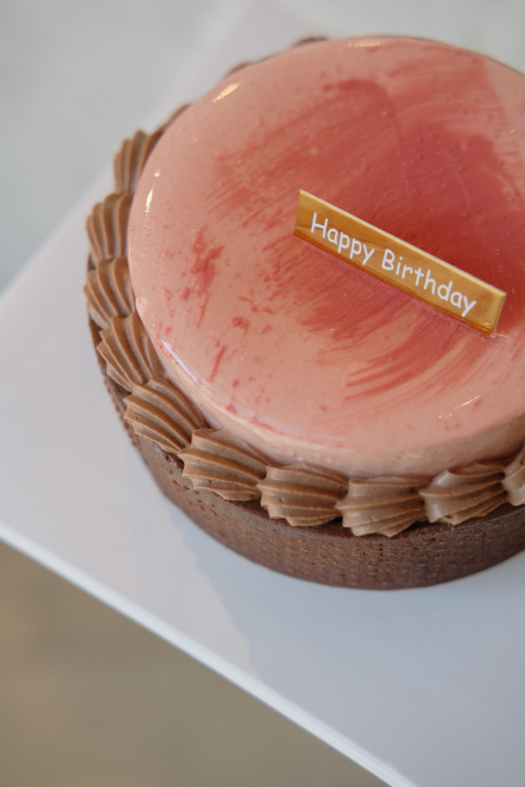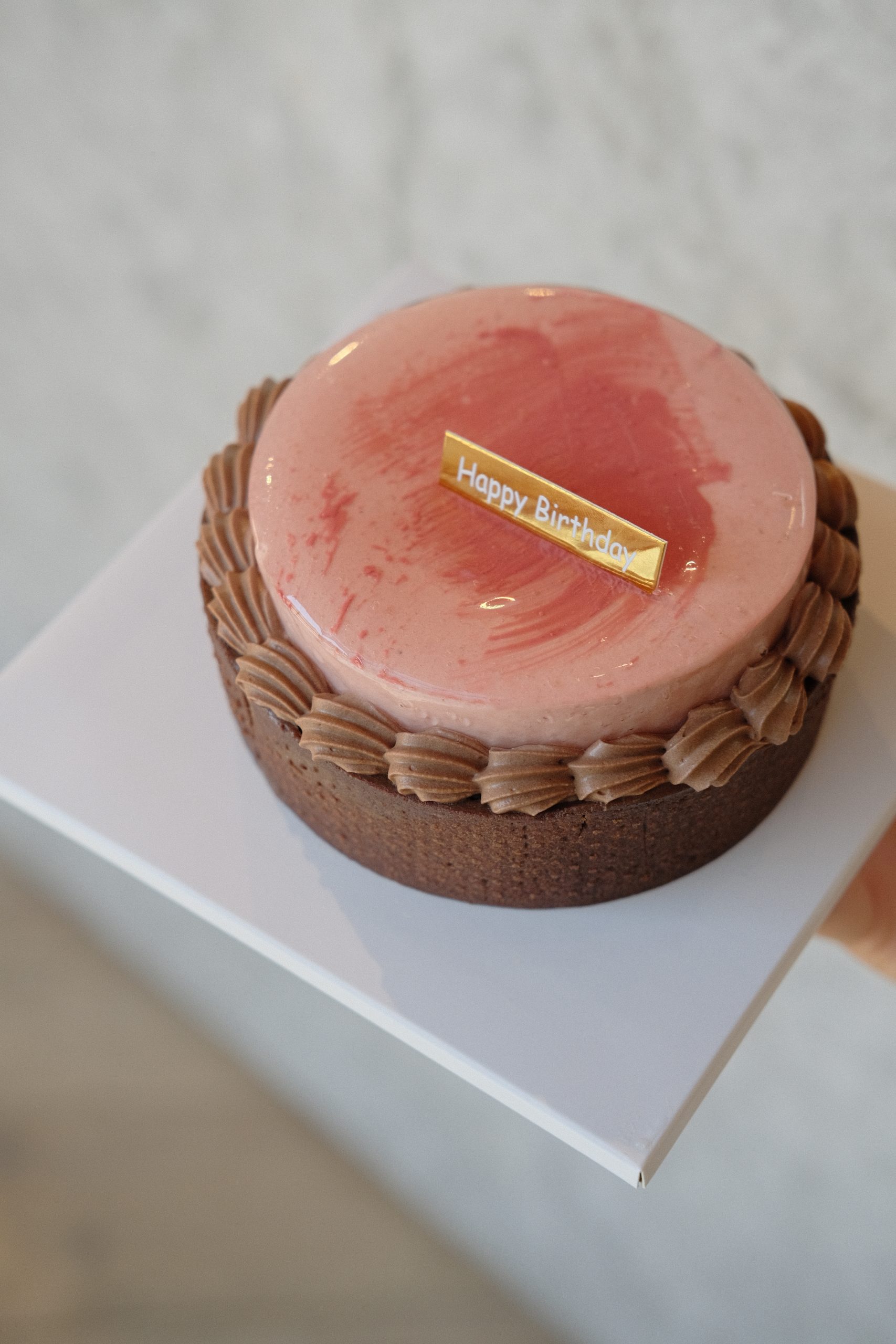 Discover our newest creation — a 5 inch mousse tart that beautifully balances rich dark chocolate with the freshness of strawberry. This elegant dessert features a hand-crafted chocolate sablé tart shell, a crunchy feuilletine base, dark chocolate sponge, and a silky caramelised dark chocolate ganache. It is topped with strawberry mousse filled with strawberry confit, and finished with dark chocolate whipped cream decorations.